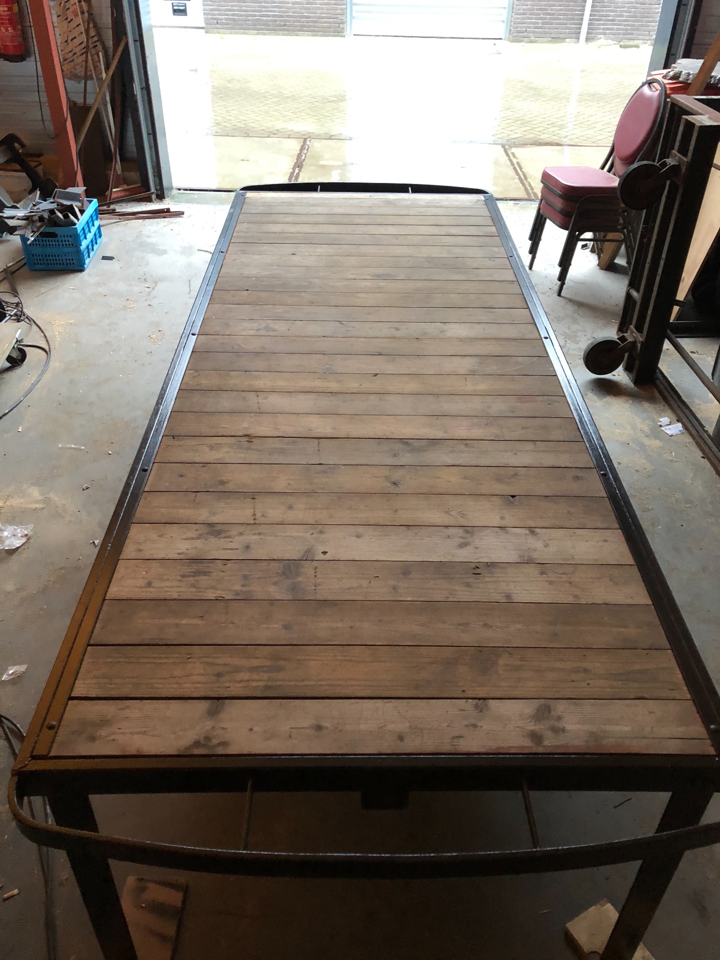 De oude wagonplanken zijn hergebruikt om het tafelblad af te maken en zo de oude gebruikte look te houden.