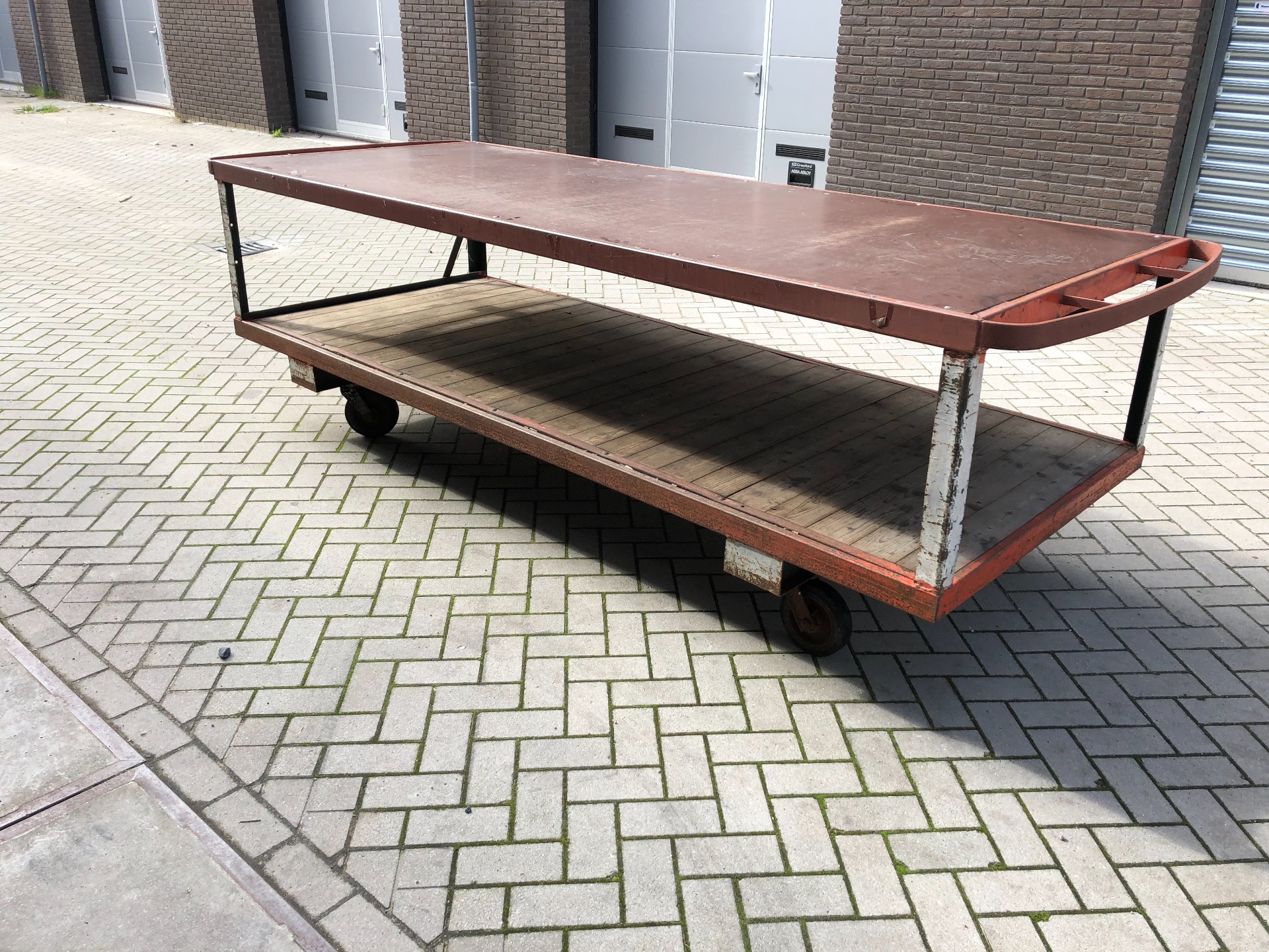 Deze schitterende robuuste wagontafel is omgebouwd vanuit een oude wagonwagen die ze vroeger op de bloemenveilingen gebruikte.
